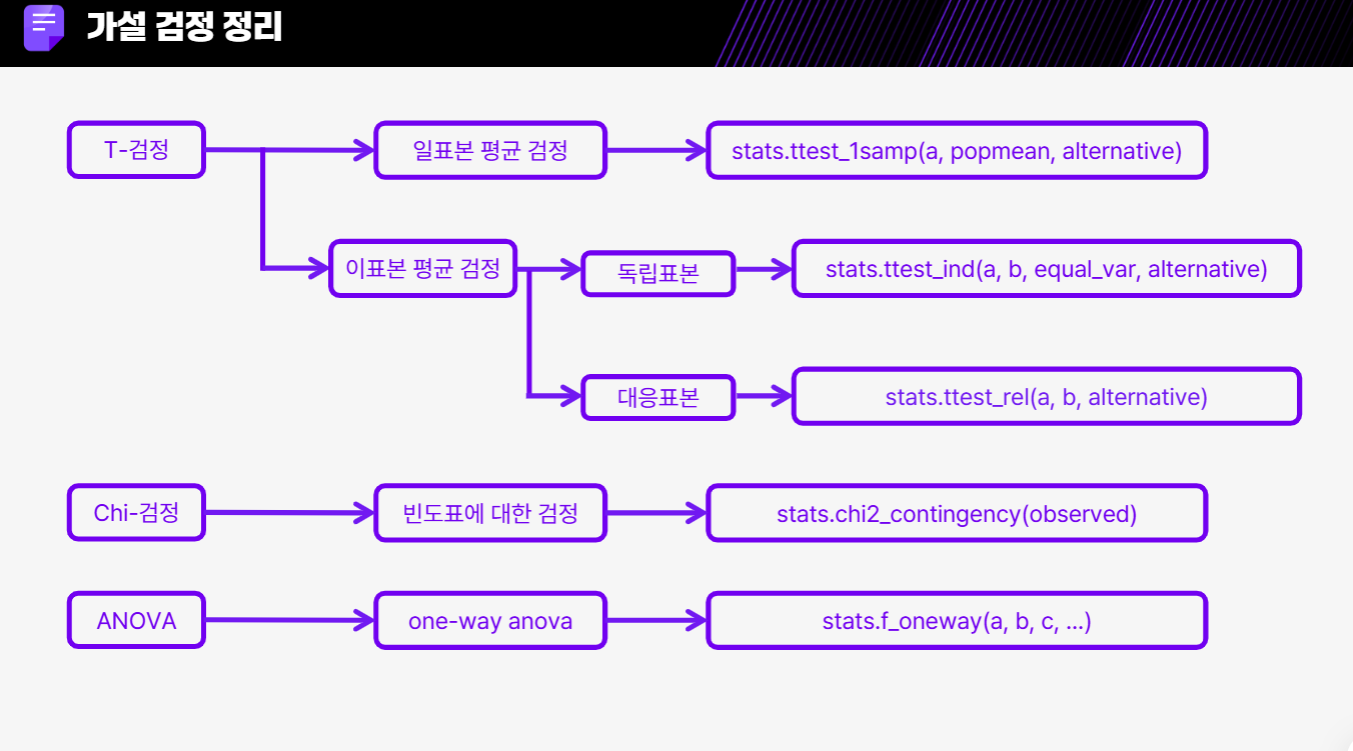 | 단일표본 t-test | stats.ttest_1samp() | 한 집단 평균 vs 기준값 비교 |